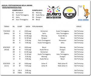 Sukan bola jaring merupakan di antara 13 disiplin sukan yang dipertandingkan dalam temasya Sukan Terengganu (Sutera) 2019 di mana mewajibkan penyertaan atlet adalah di bawah umur 20 tahun ke bawah bagi setiap kontijen. Menjadikan penganjuran ini sebagai sukan patuh syariah pertama di Malaysia maka setiap pemain hendaklah memakai Baju-T atau Jersi dengan ‘trackbottom’ serta WAJIB bertudung bagi yang beragama Islam (tanpa pin dan jarum). ‘Skirt’, seluar pendek dan ‘tight’ tidak dibenarkan. Hanya satu pingat emas ditawarkan untuk acara sukan bola jaring ini.